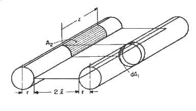 B-101: Differential ring on surface of right circular cylinder to finite area on surface of parallel cylinder of the same diameter. End of finite area is opposite the ring. Axes of cylinders are connected by thin plate of width 2l.